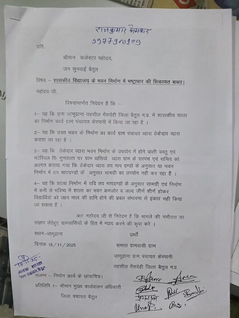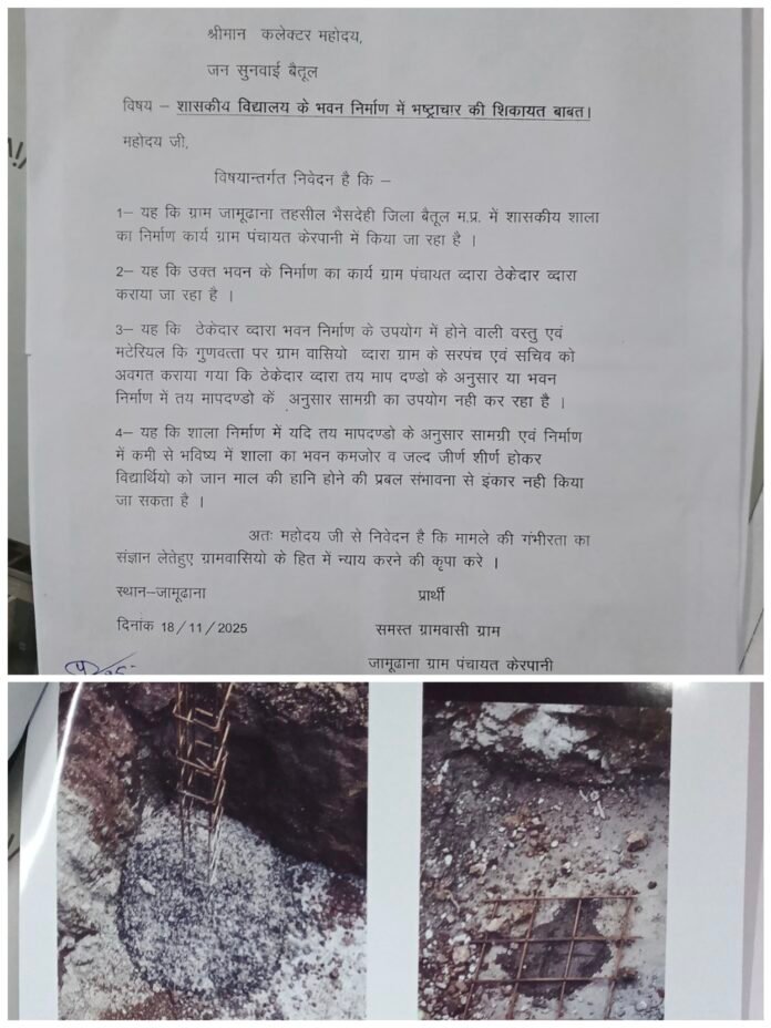 जिसकी जांच को लेकर ग्रामीण अधिकारीयों की प्रतीक्षा करते रहे किंतु कोई भी अधिकारी अब तक शिकायत की जांच करने नहीं पहुंचे पिछली शिकायत 19/11/2025 को की थी जिसकी जांच अभी तक नहीं की गई जिससे नाराज ग्रामीणों ने पुनः बैतूल कलैक्ट्रेट में जाकर शिकायत की है कि स्कूल भवन निर्माण में हो रहे भ्रष्टाचार की जांच कर उचित मापदंडों एवं गुणवत्तापूर्ण भवन का निर्माण कार्य किया जाए