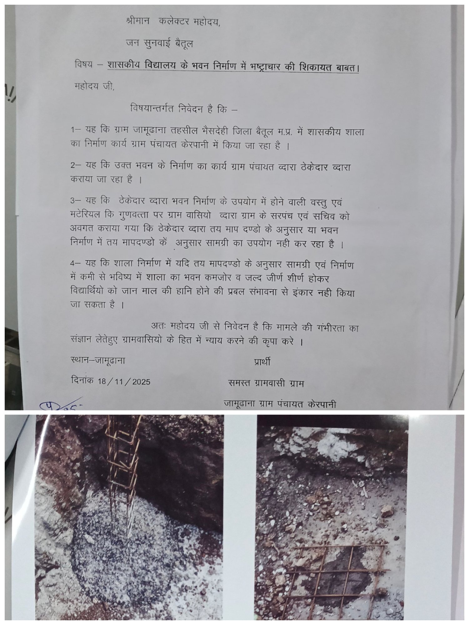 ग्राम जामूढाना में हो रहे प्राथमिक शाला भवन निर्माण में भ्रष्टाचार के खिलाफ पूर्व में कलेक्ट्रेट में की थी शिकायत, जिसका निराकरण अभी तक नहीं किया गया