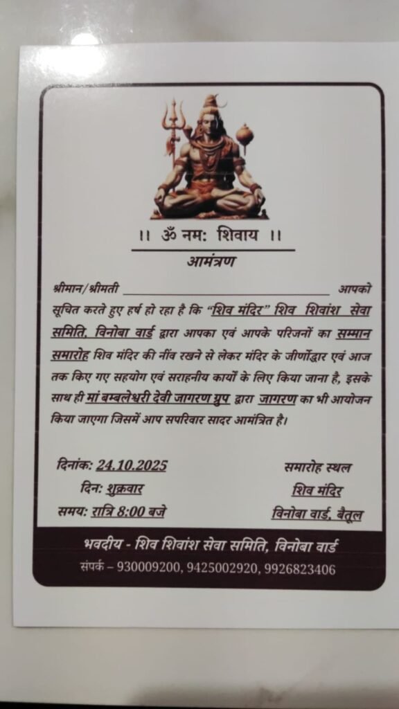 इस अवसर पर मां बमलेश्वरी देवी जागरण ग्रुप बैतूल के कलाकारों द्वारा सुंदर भजनों की प्रस्तुति दी जाएगी। जागरण में भजन गायक भूषण पंडाग्रे, भजन गायिका एवं ढोल वादिका यशस्वी सत्यम् टोरिया और भजन गायक सत्यम् टोरिया भक्तिमय प्रस्तुति देंगे। समूह संचालक एवं भजन गायक योगेश शर्मा के नेतृत्व में भक्ति रस की अविरल धारा प्रवाहित होगी। इस आयोजन में मंदिर की नींव रखने से लेकर आज तक सहयोग और सराहनीय कार्य करने वाले श्रद्धालुओं का सम्मान भी किया जाएगा। कार्यक्रम का आयोजन रात्रि 8 बजे से शिव मंदिर, विनोबा वार्ड में होगा। शिव शिवांश सेवा समिति ने सभी श्रद्धालुओं से इस धार्मिक आयोजन में शामिल होने का आग्रह किया है।