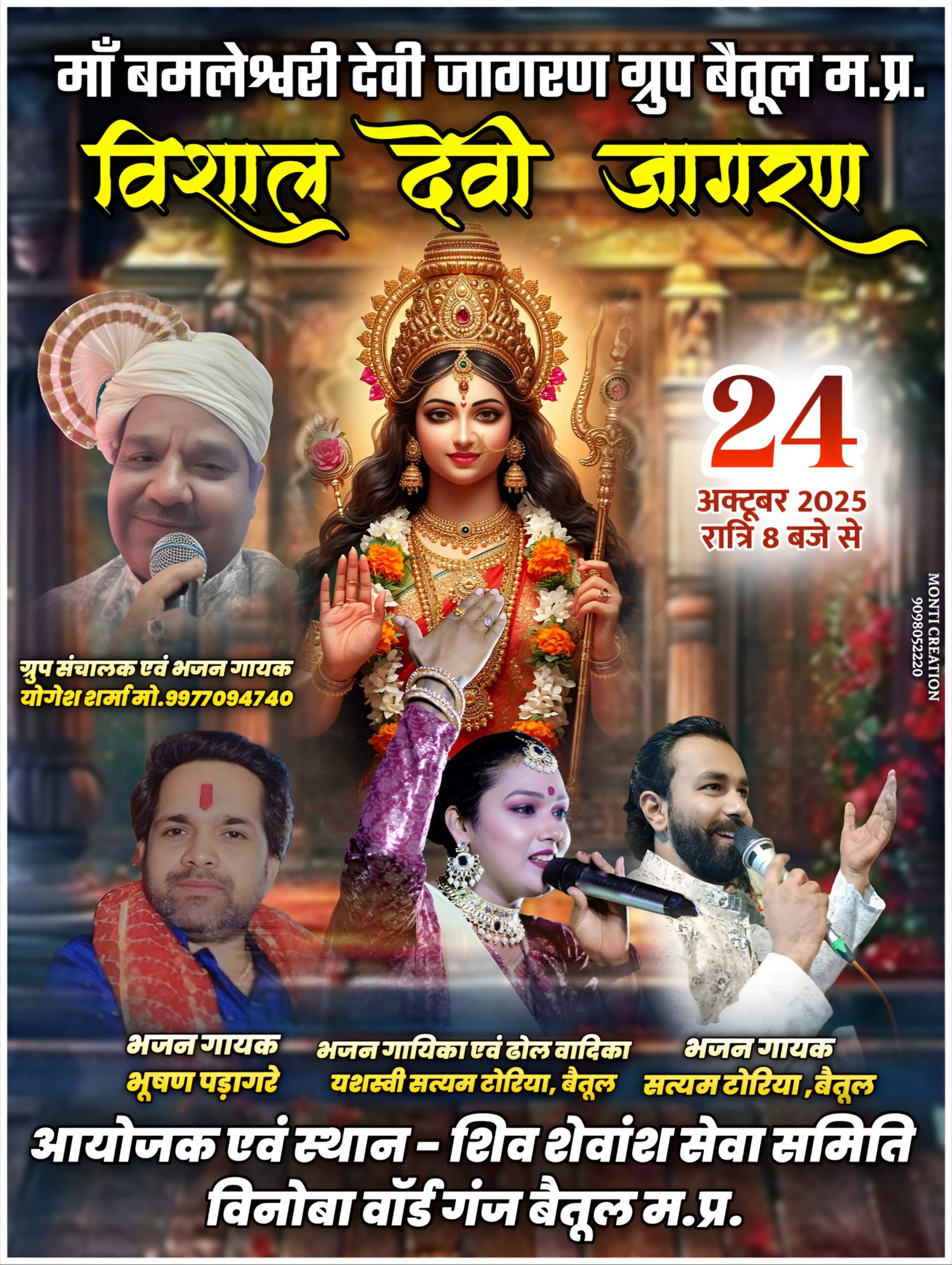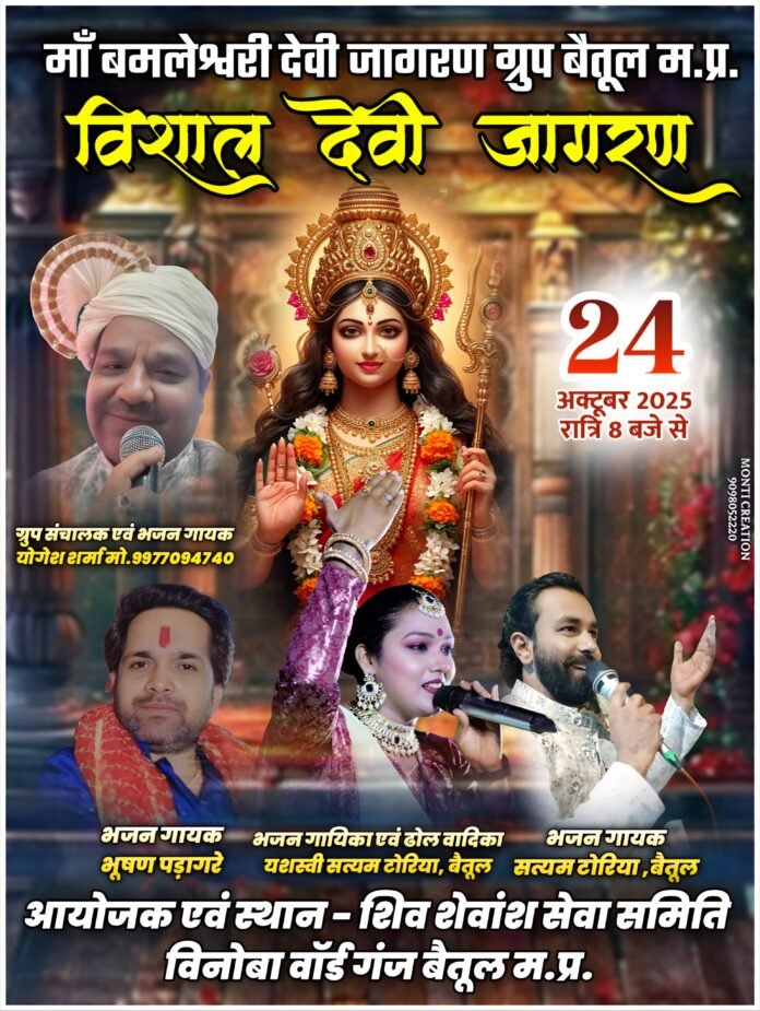 बैतूल:- शिव शिवांश सेवा समिति विनोबा वार्ड द्वारा आज शुक्रवार 24 अक्टूबर को शिव मंदिर प्रांगण में भव्य देवी जागरण का आयोजन किया जा रहा है।